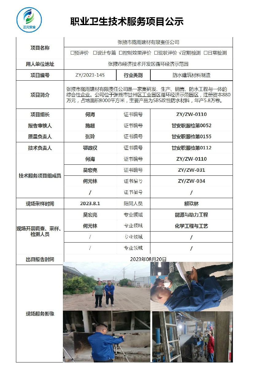 张掖市陇雨建材有限责任公司职业病危害因素检测