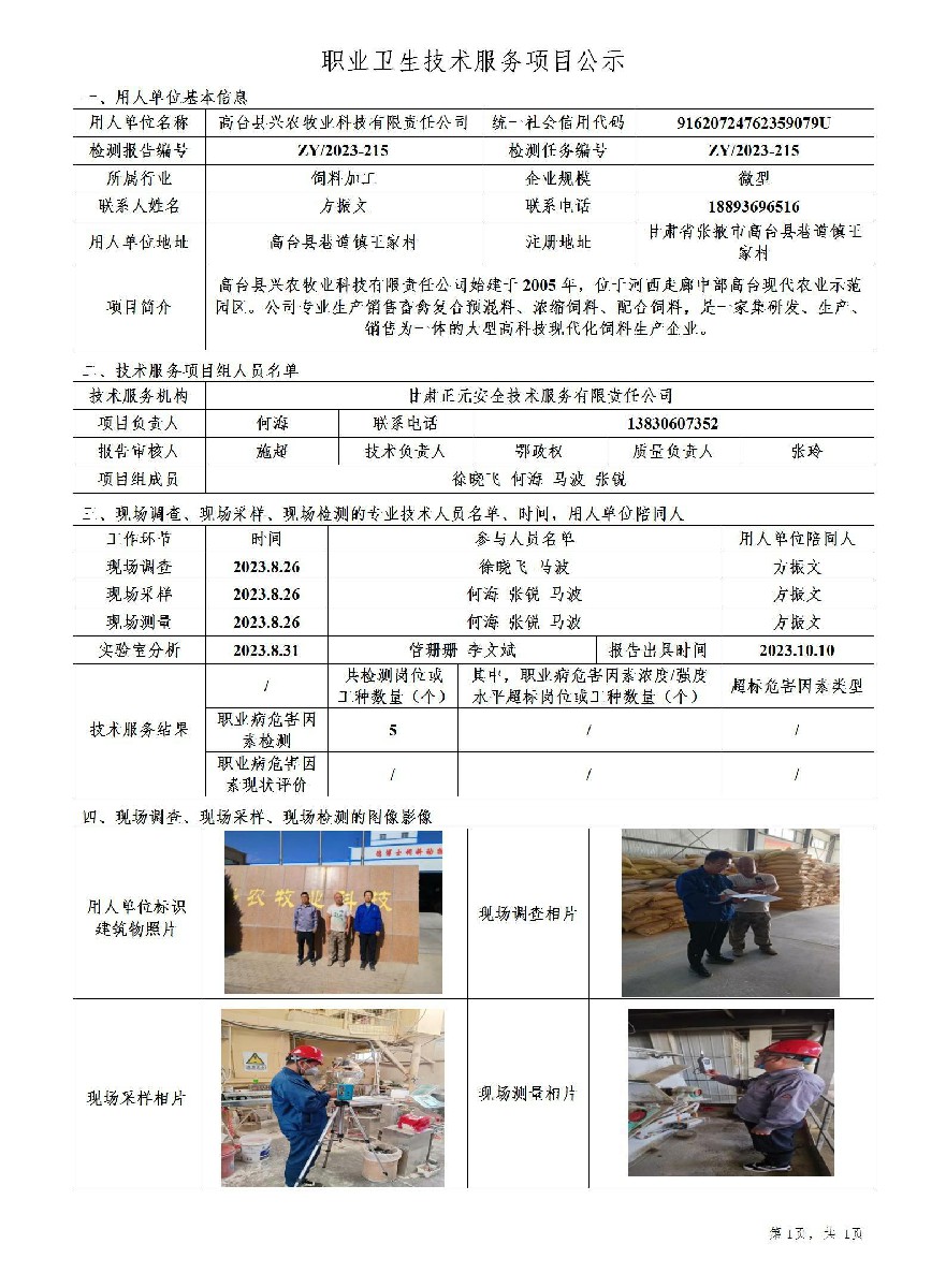 高台县兴农牧业科技有限责任公司职业病危害因素定期检测