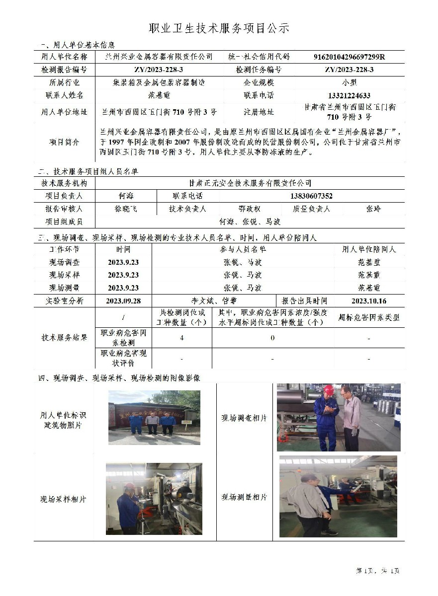 兰州兴业金属容器有限责任公司防冻液分装项目职业病危害因素检测
