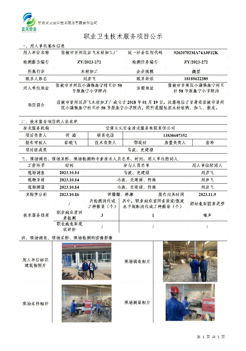 张掖市甘州区彦飞木材加工厂职业病危害因素检测