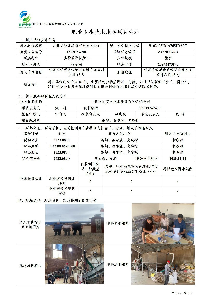 古浪县绿能环保有限责任公司职业病危害现状评价