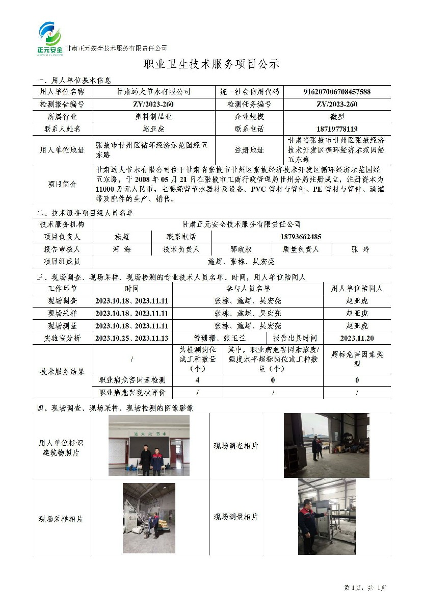 甘肃远大节水有限公司职业病危害因素检测