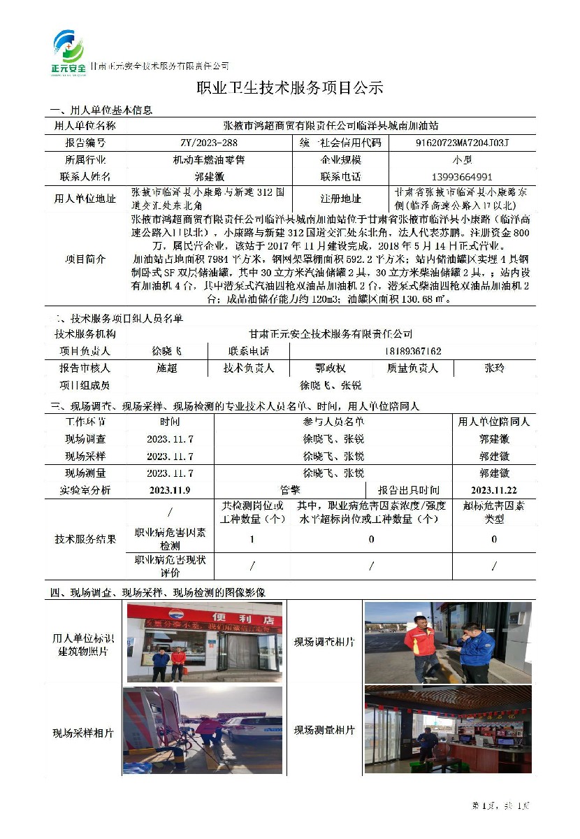张掖市鸿超商贸有限责任公司临泽县城南加油站职业病危害因素检测