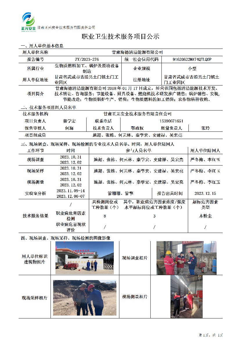 甘肃海德清洁能源有限公司年产60000吨生物质燃料生产线及生物质锅炉生产线职业病危害因素定期检测