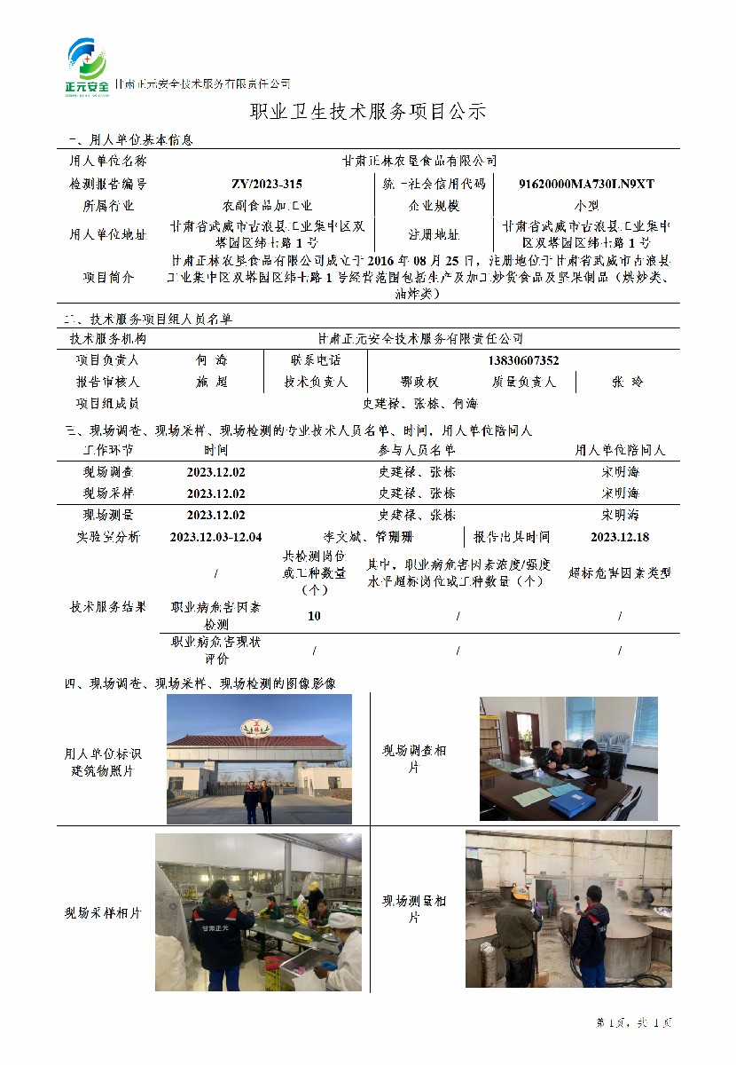 甘肃正林农垦食品有限公司职业病危害因素检测