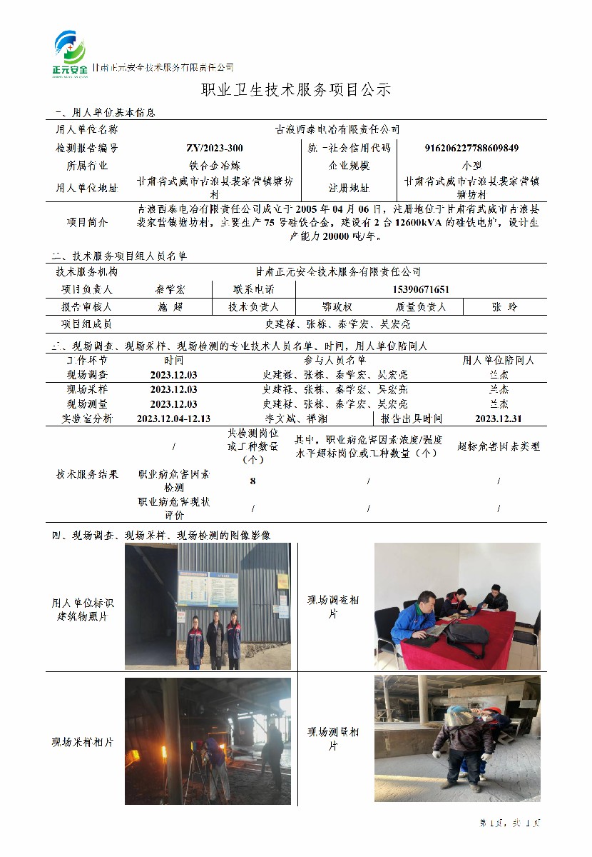 古浪西泰电冶有限责任公司职业病危害因素检测