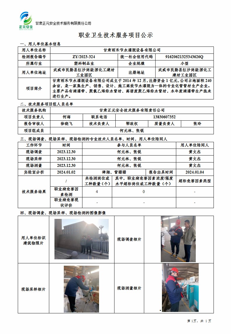 甘肃雨禾节水灌溉设备有限公司职业病危害因素定期检测