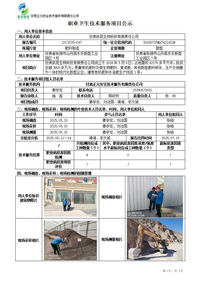 甘肃辰昆生物科技有限责任公司职业病危害因素定期检测