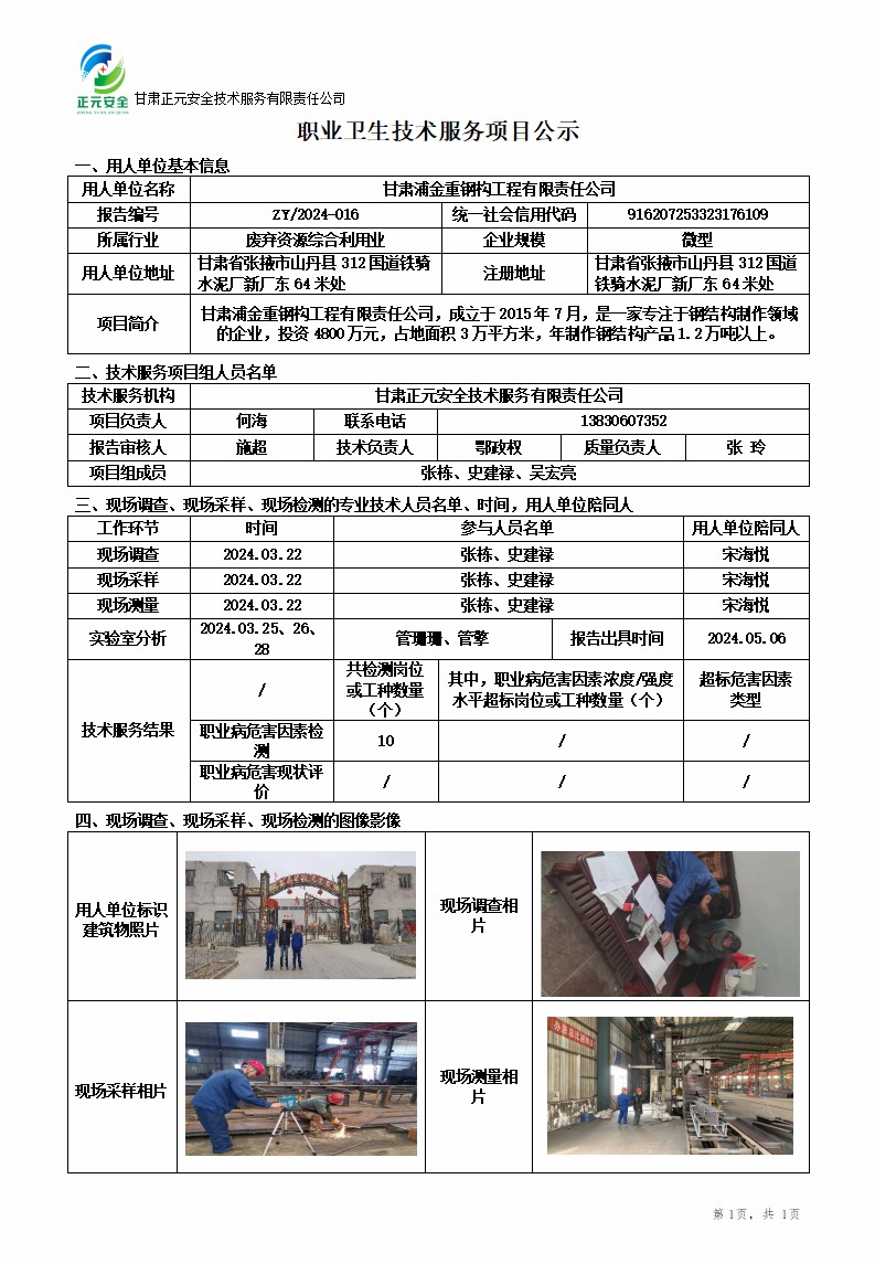 甘肃浦金重钢构工程有限责任公司年产1.2万吨钢结构加工项目职业病危害因素检测