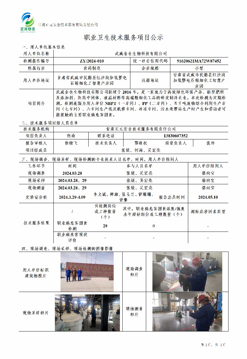 武威金仓生物科技有限公司NBPT(一车间)、PP(二车间)、五千吨废物综合利用生产项目(七车间)、六车间生产线及机修车间、冷冻车间、污水处理车间生产项目职业病危害因素定期检测