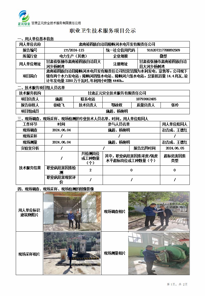 肃南裕固族自治县隆畅河水电开发有限责任公司隆畅河四级、六级水电站职业病危害因素检测