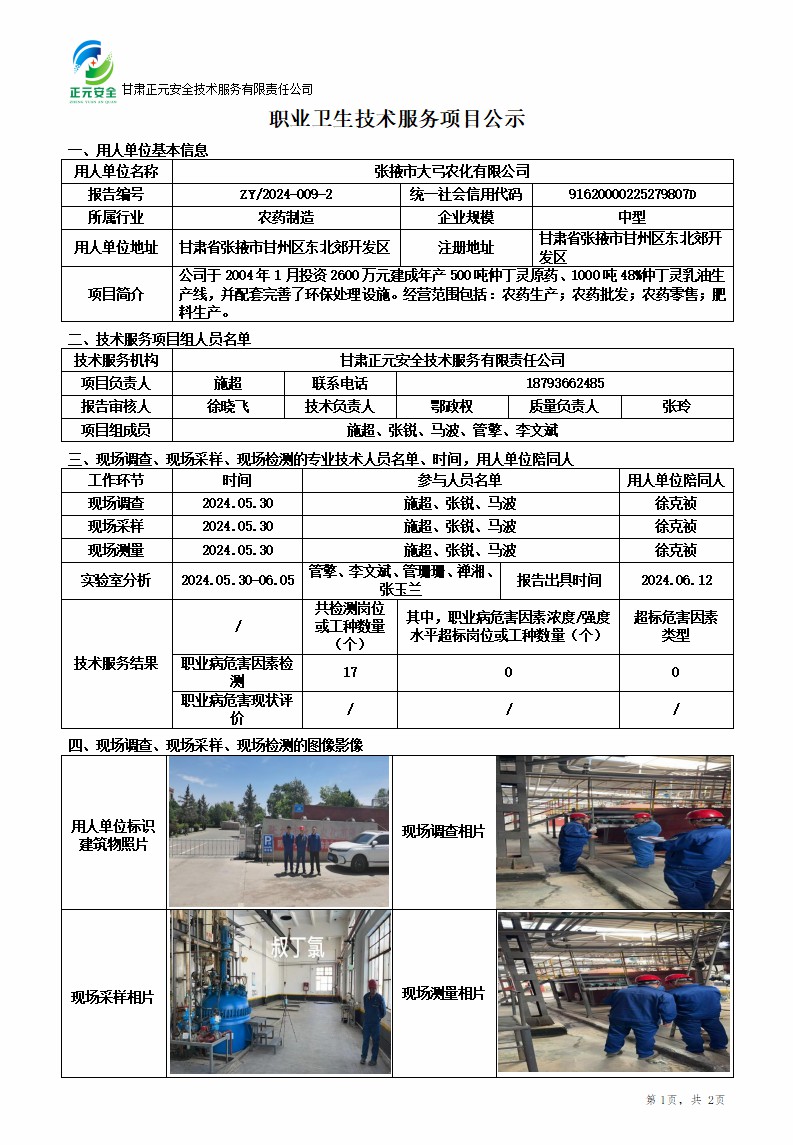 张掖市大弓农化有限公司仲丁灵基地职业病危害因素检测