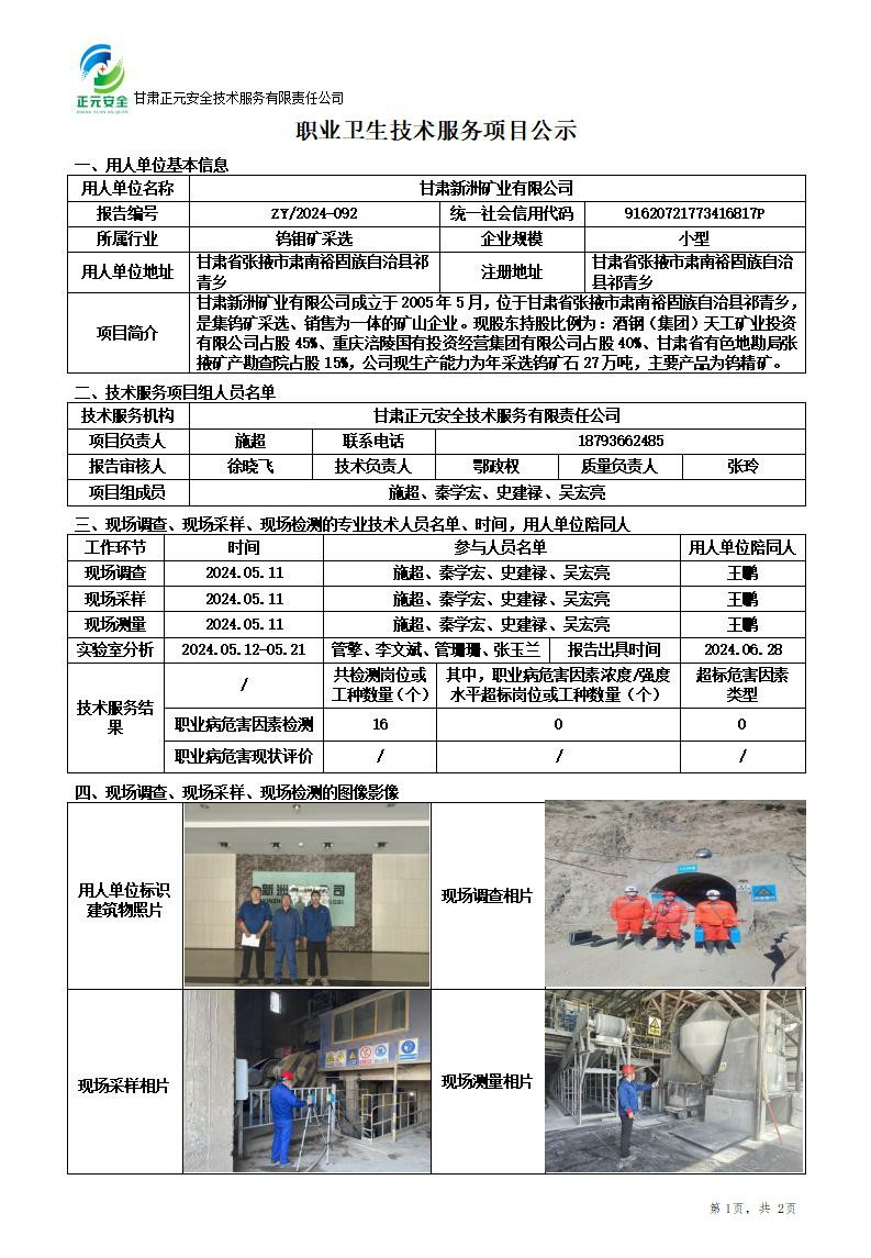 甘肃新洲矿业有限公司2024年度职业病危害因素定期检测