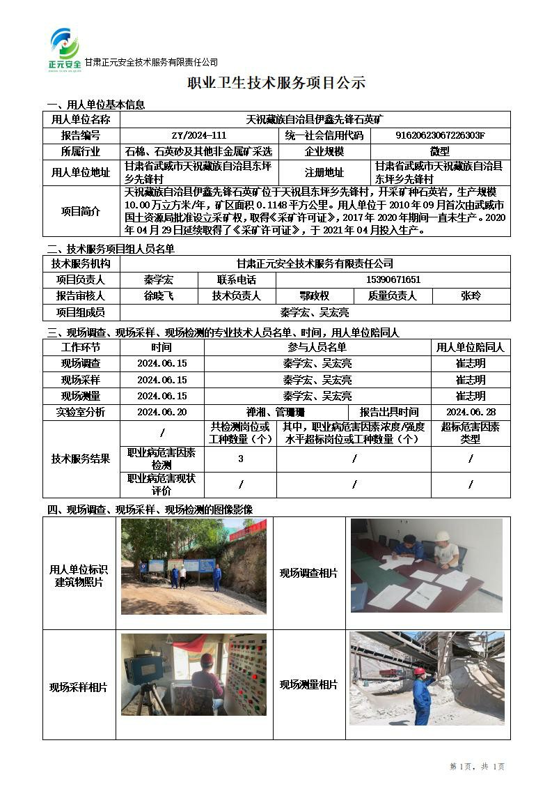 天祝藏族自治县伊鑫先锋石英矿年产10万吨石英岩开采项目职业病危害因素检测