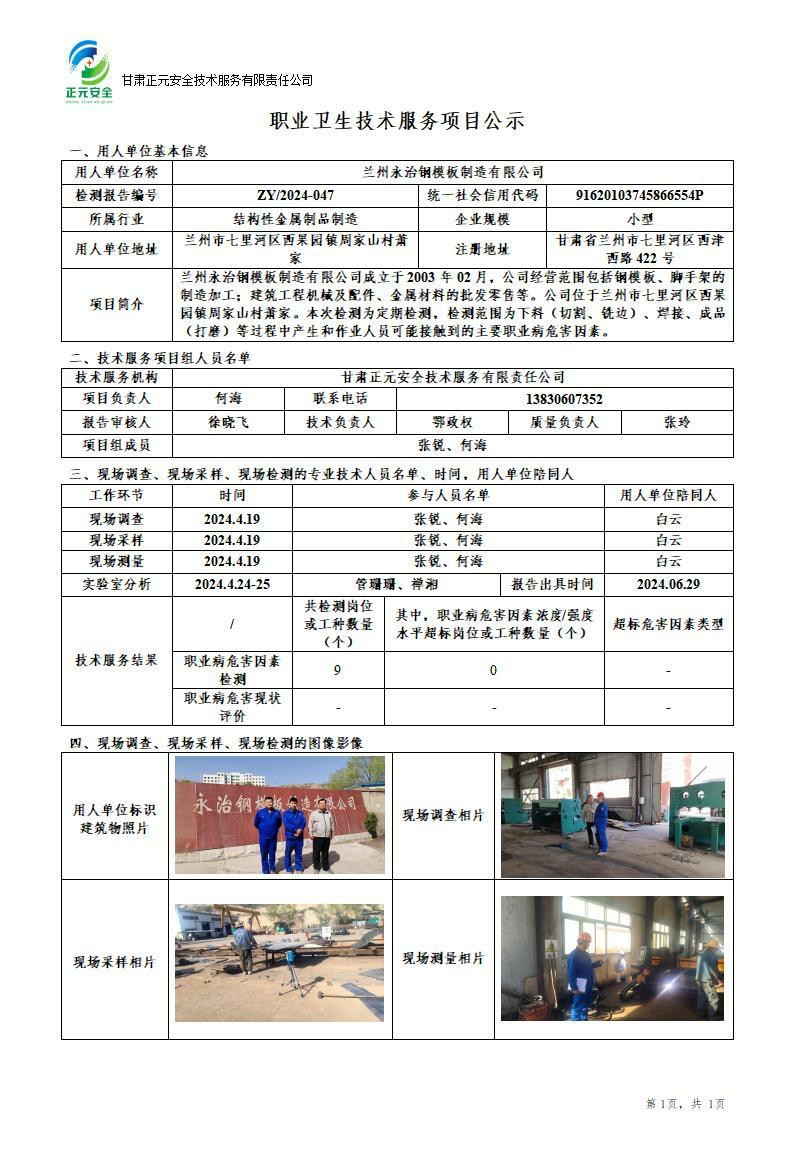 兰州永治钢模板制造有限公司职业病危害因素定期检测