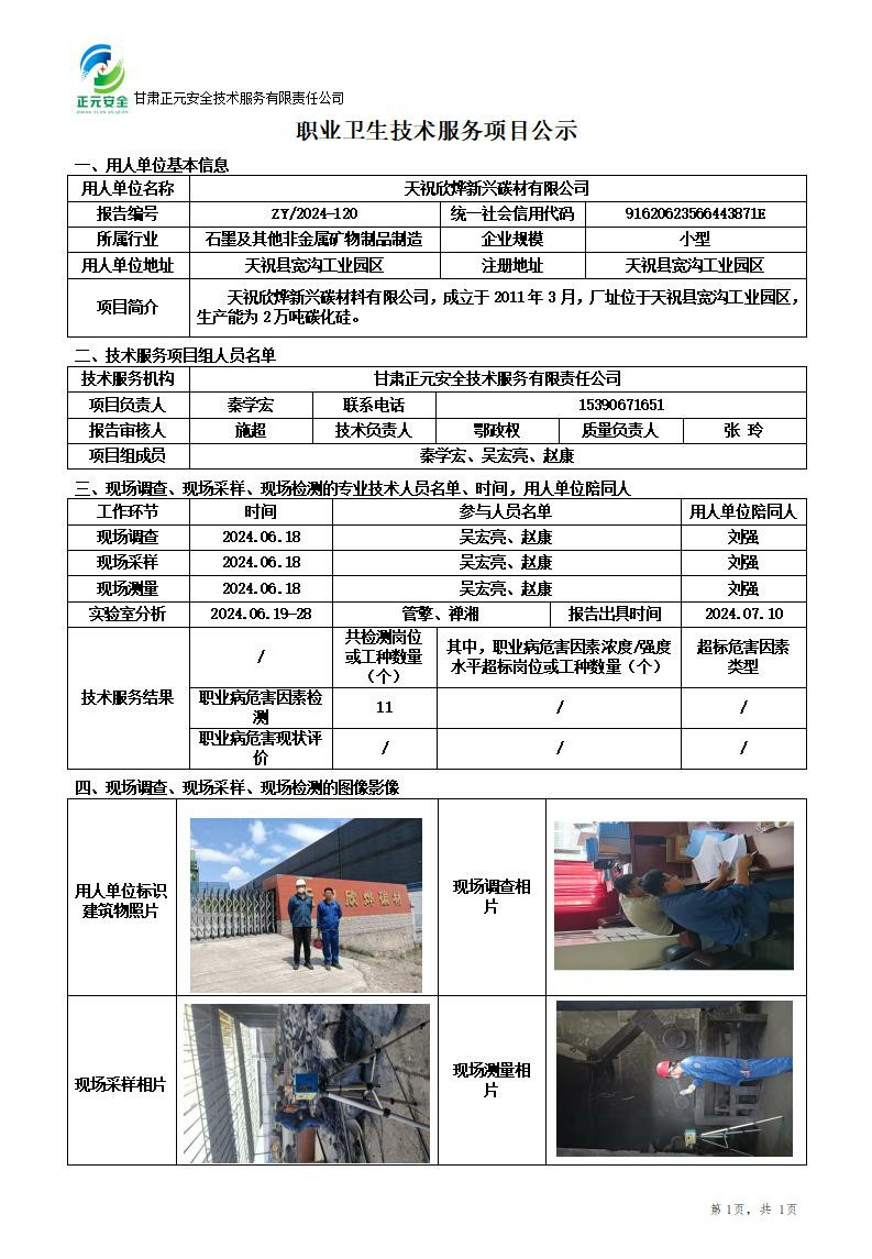 天祝欣烨新兴碳材有限公司职业病危害因素检测