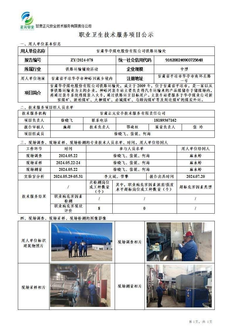 甘肃华亭煤电股份有限公司铁路运输处神峪河装车站项目职业病危害现状评价