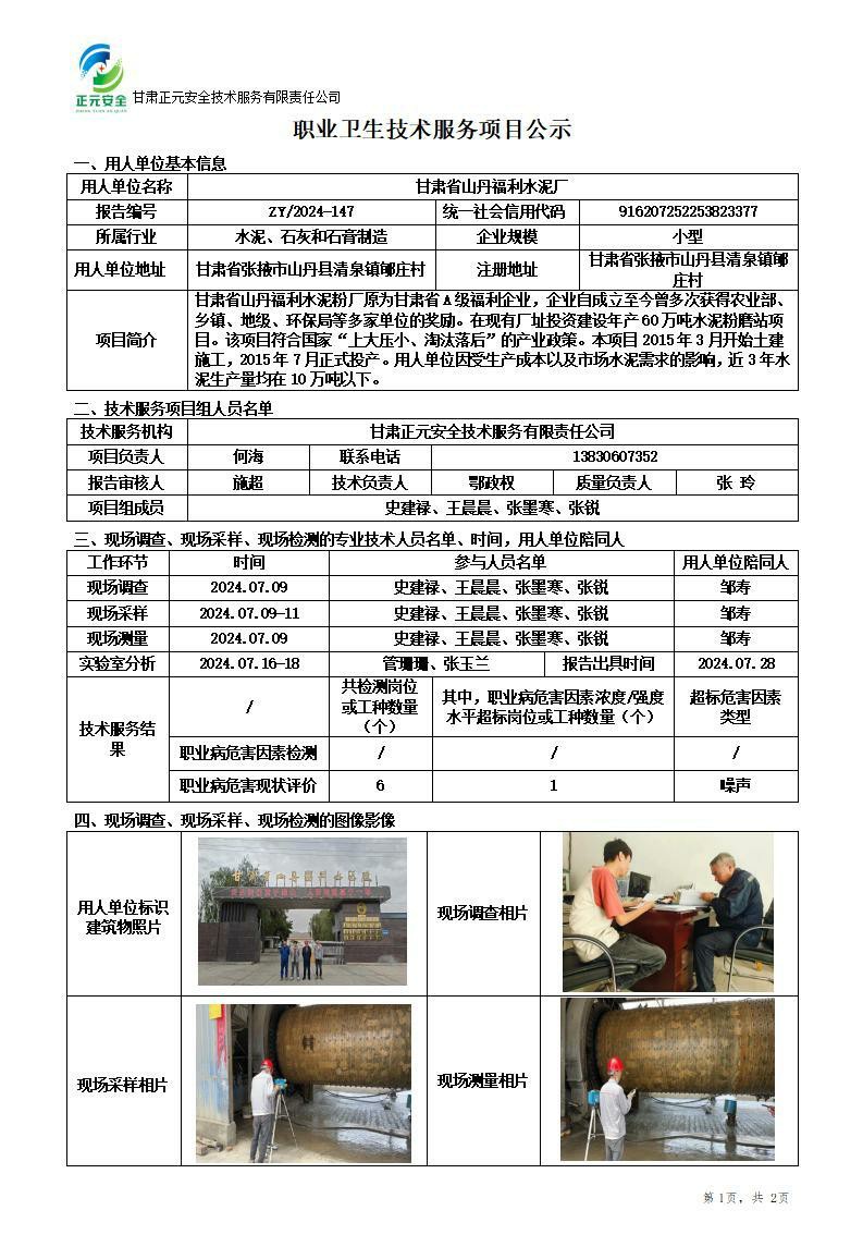 山丹县石燕水泥有限责任公司职业病危害现状评价