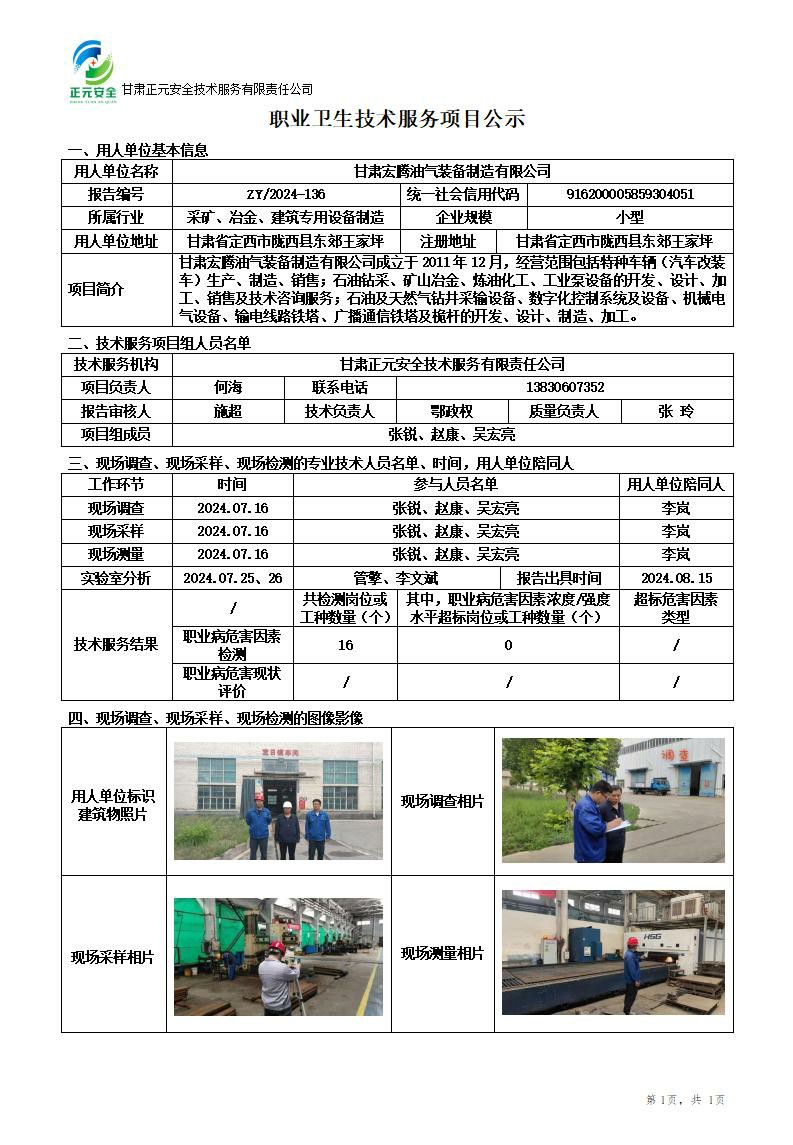 甘肃宏腾油气装备制造有限公司职业病危害因素检测