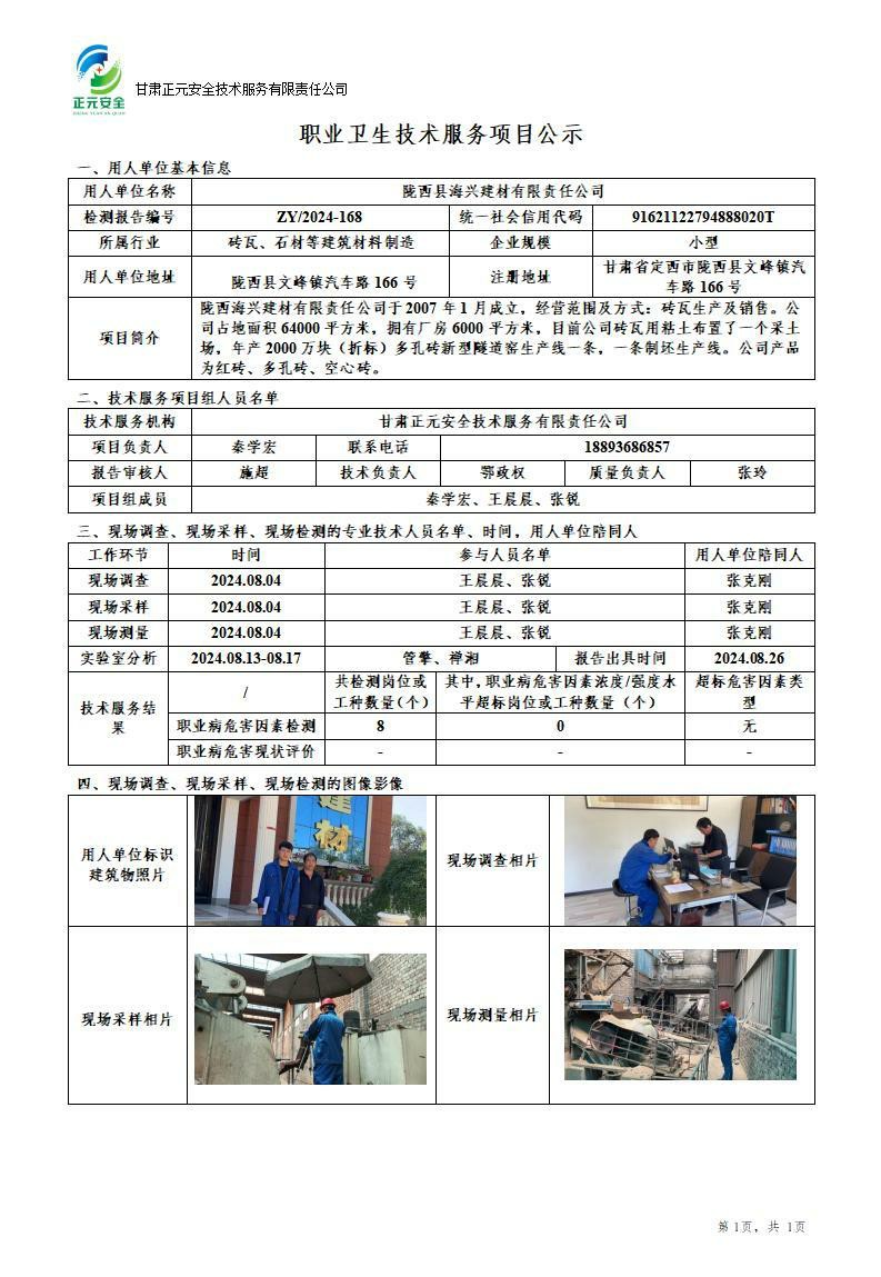 陇西县海兴建材有限责任公司职业病危害因素检测