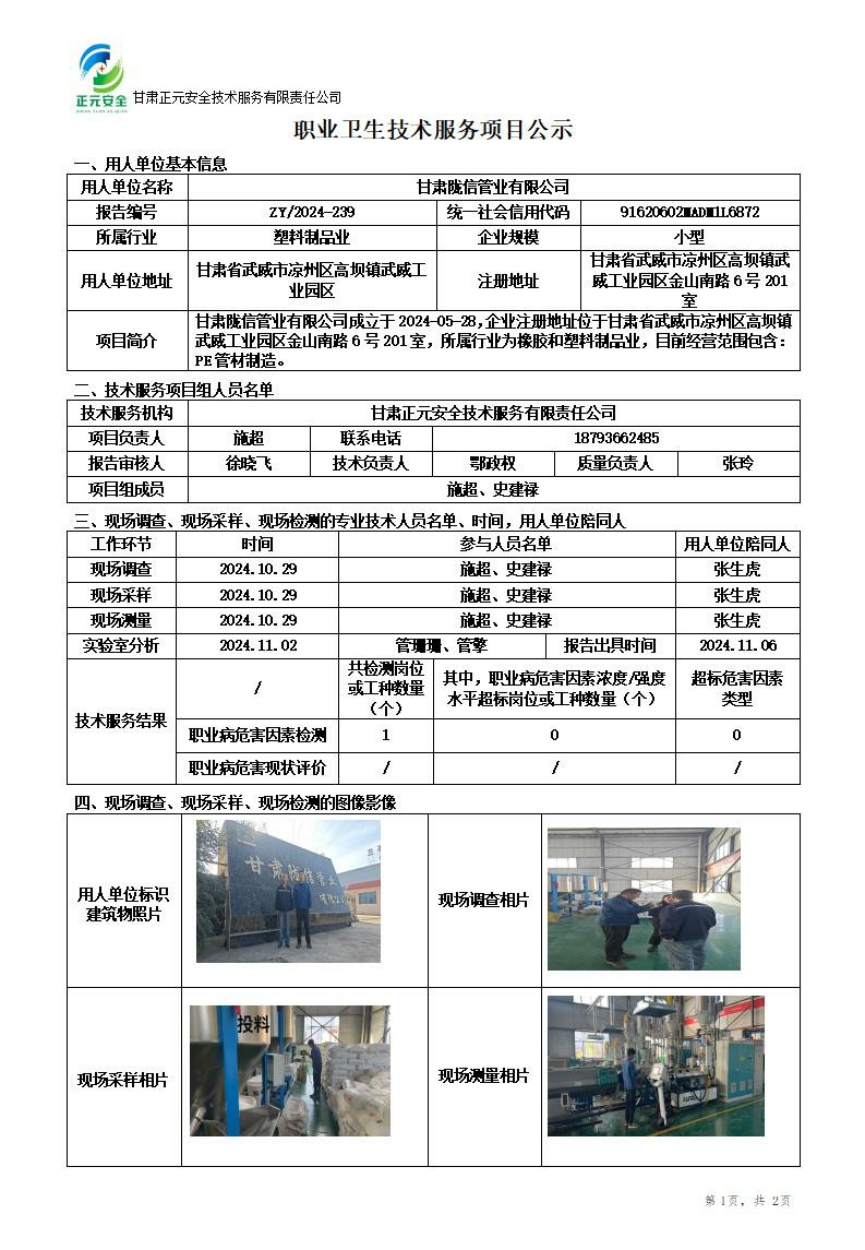 甘肃陇信管业有限公司年产15000吨PE塑料管材生产线职业病危害因素检测