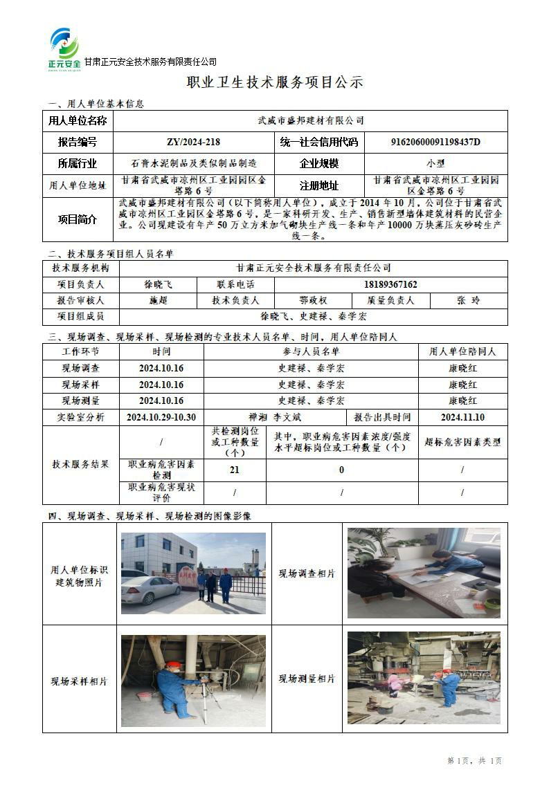 武威市盛邦建材有限公司职业病危害因素定期检测
