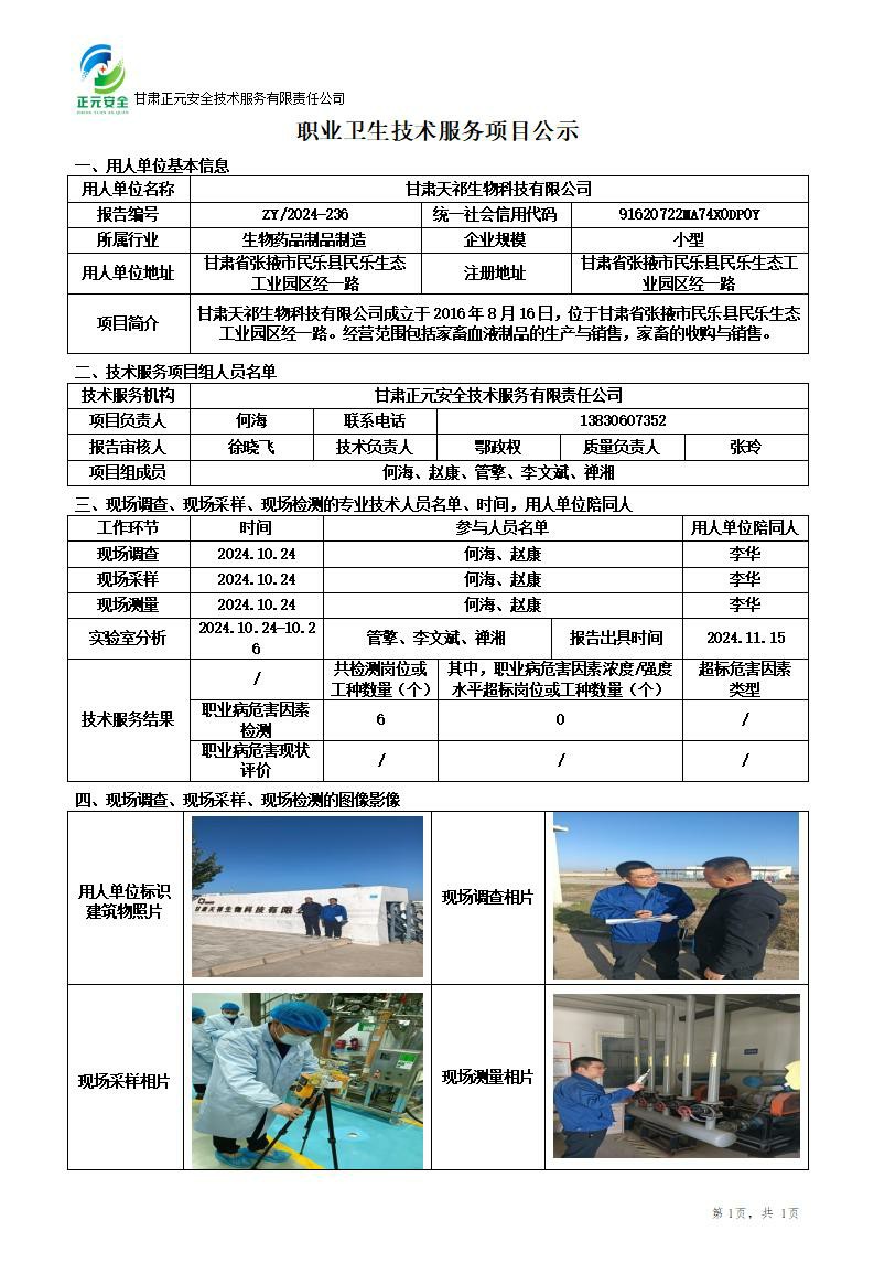 甘肃天祁生物科技有限公司职业病危害因素检测