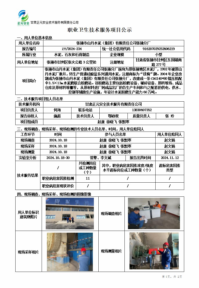 张掖市山丹水泥(集团)有限责任公司张掖分厂水泥粉磨站生产线职业病危害因素检测