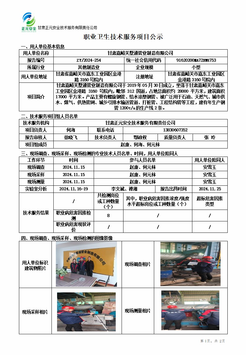 甘肃嘉峪关墅通管业制有限公司职业病危害因素检测