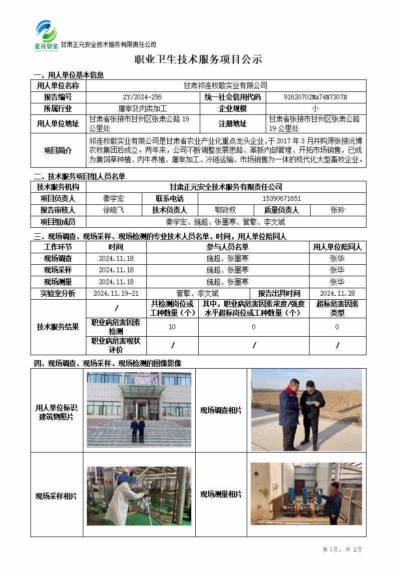 甘肃祁连牧歌实业有限公司职业病危害因素检测