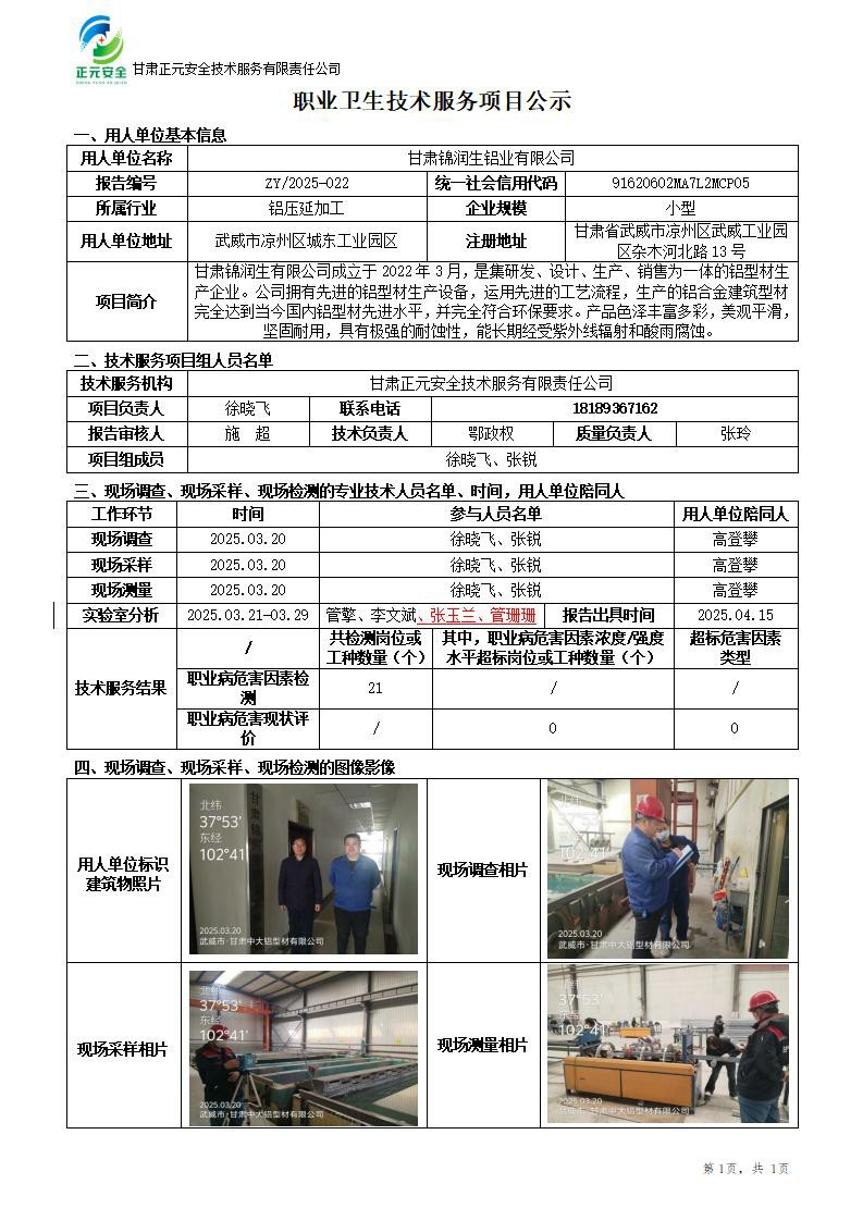甘肃锦润生铝业有限公司职业病危害因素检测