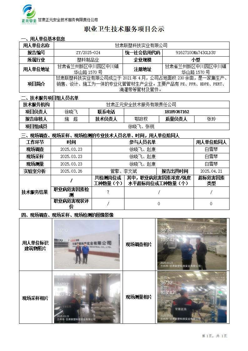 甘肃联塑科技实业有限公司职业病危害因素定期检测