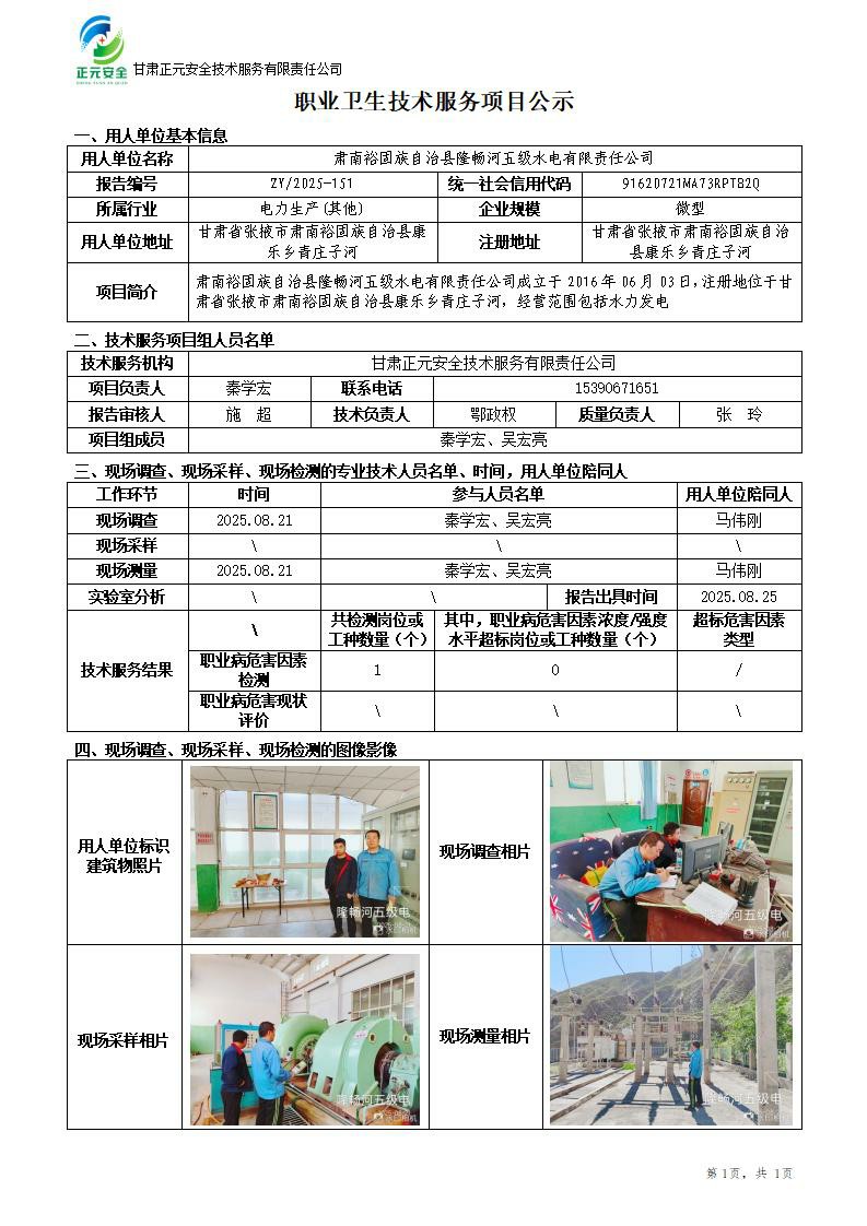 肃南裕固族自治县隆畅河五级水电有限责任公司职业病危害因素检测