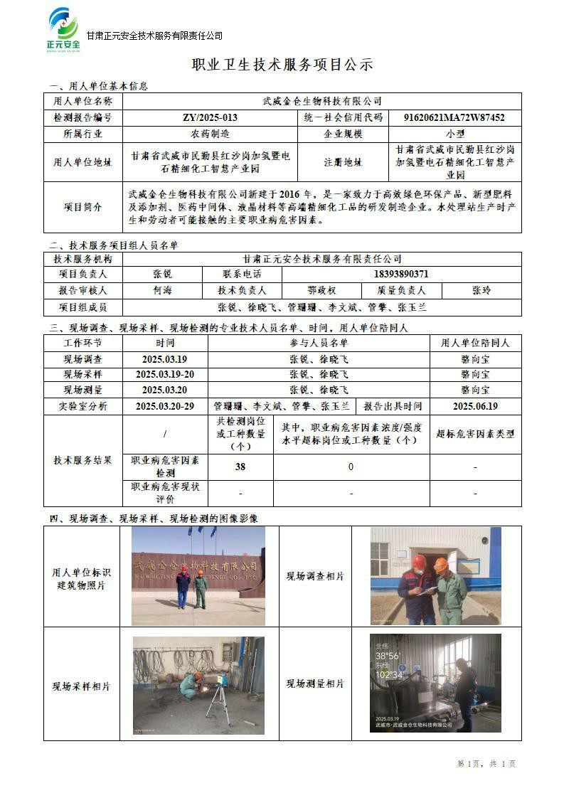 武威金仓生物科技有限公司(DMPP)生产线、  MFU生产线 、NBPT(一车间)生产线、PP(二车间)生产线、五千吨废物综合利用生产线(含七车间和六车间)、及罐区、机修车间、冷冻车间、污水处理车间项目职业病危害因素检测