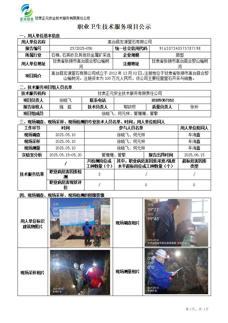 高台县宏源萤石有限公司职业病危害因素检测