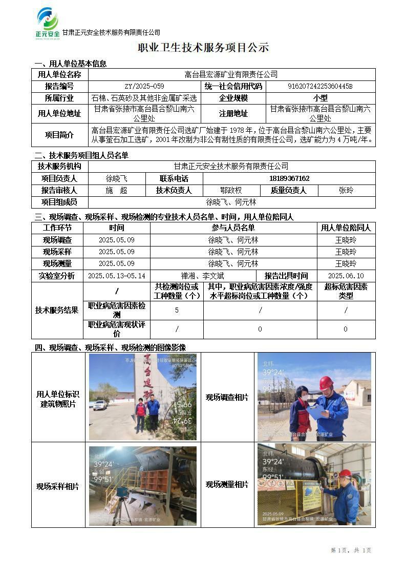 高台县宏源矿业有限责任公司职业病危害因素检测