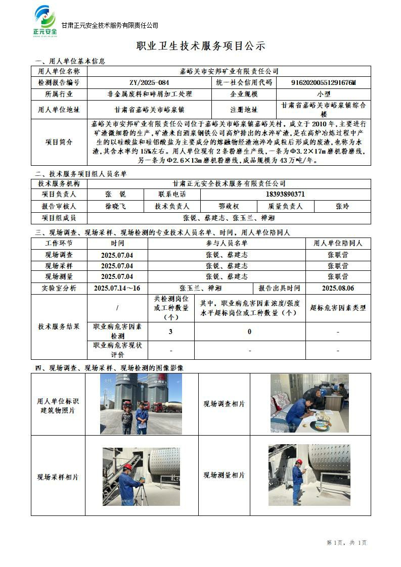 嘉峪关市安邦矿业有限责任公司职业病危害因素检测