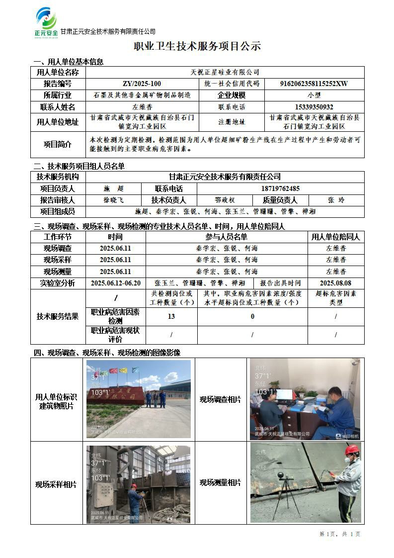 天祝正星硅业有限公司职业病危害因素检测