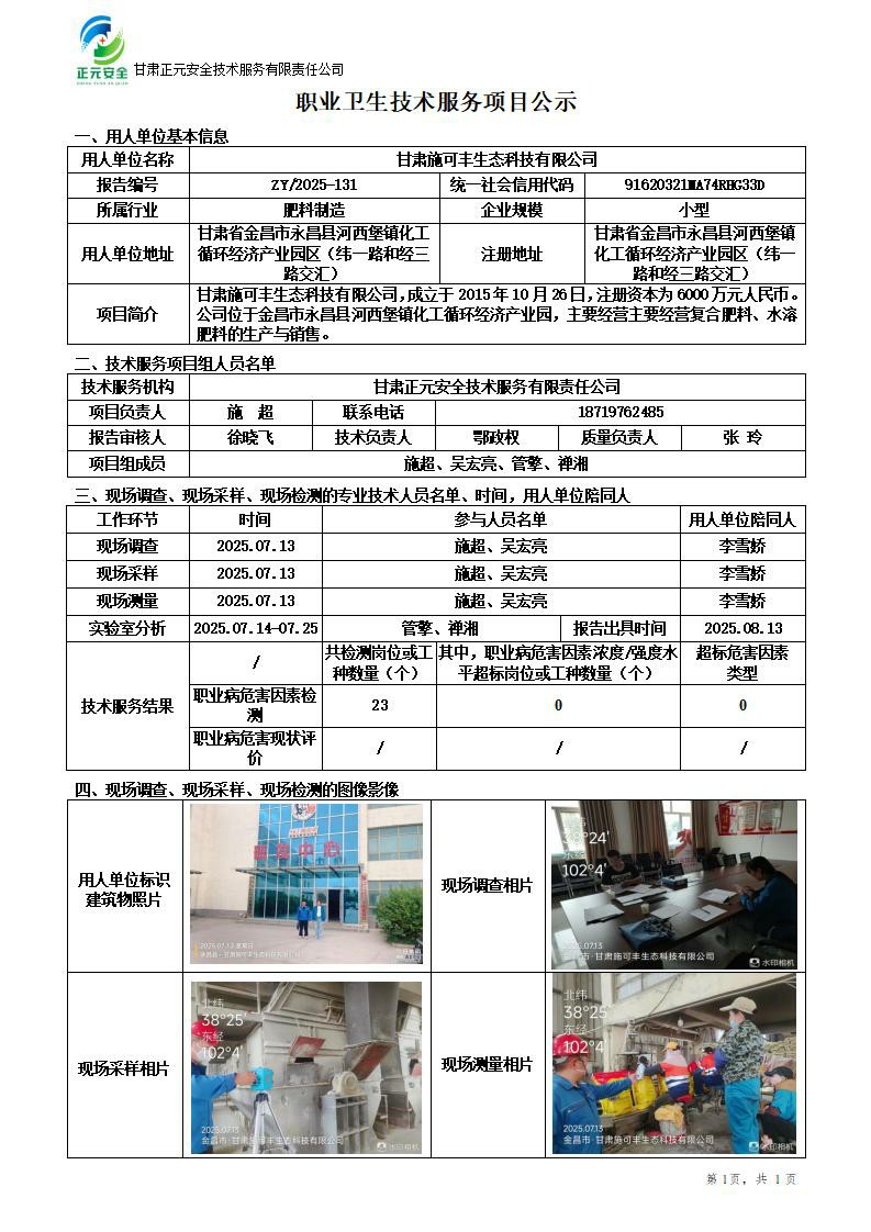 甘肃施可丰生态科技有限公司职业病危害因素检测