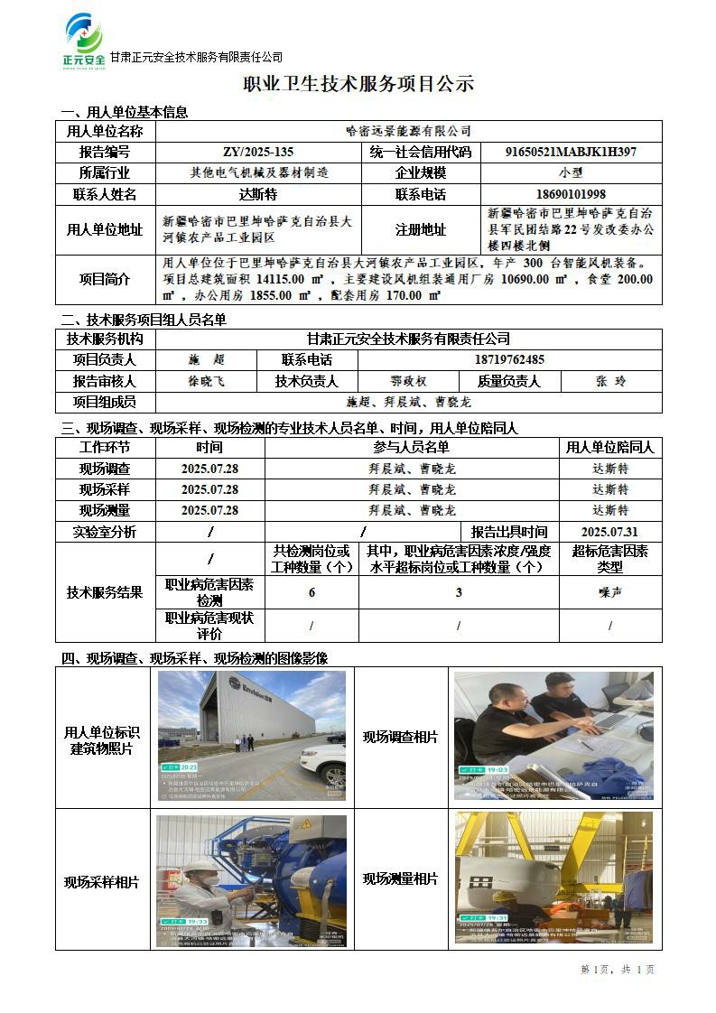 哈密远景能源有限公司哈密风机EHS团队2025年工厂职业病危害因素检测
