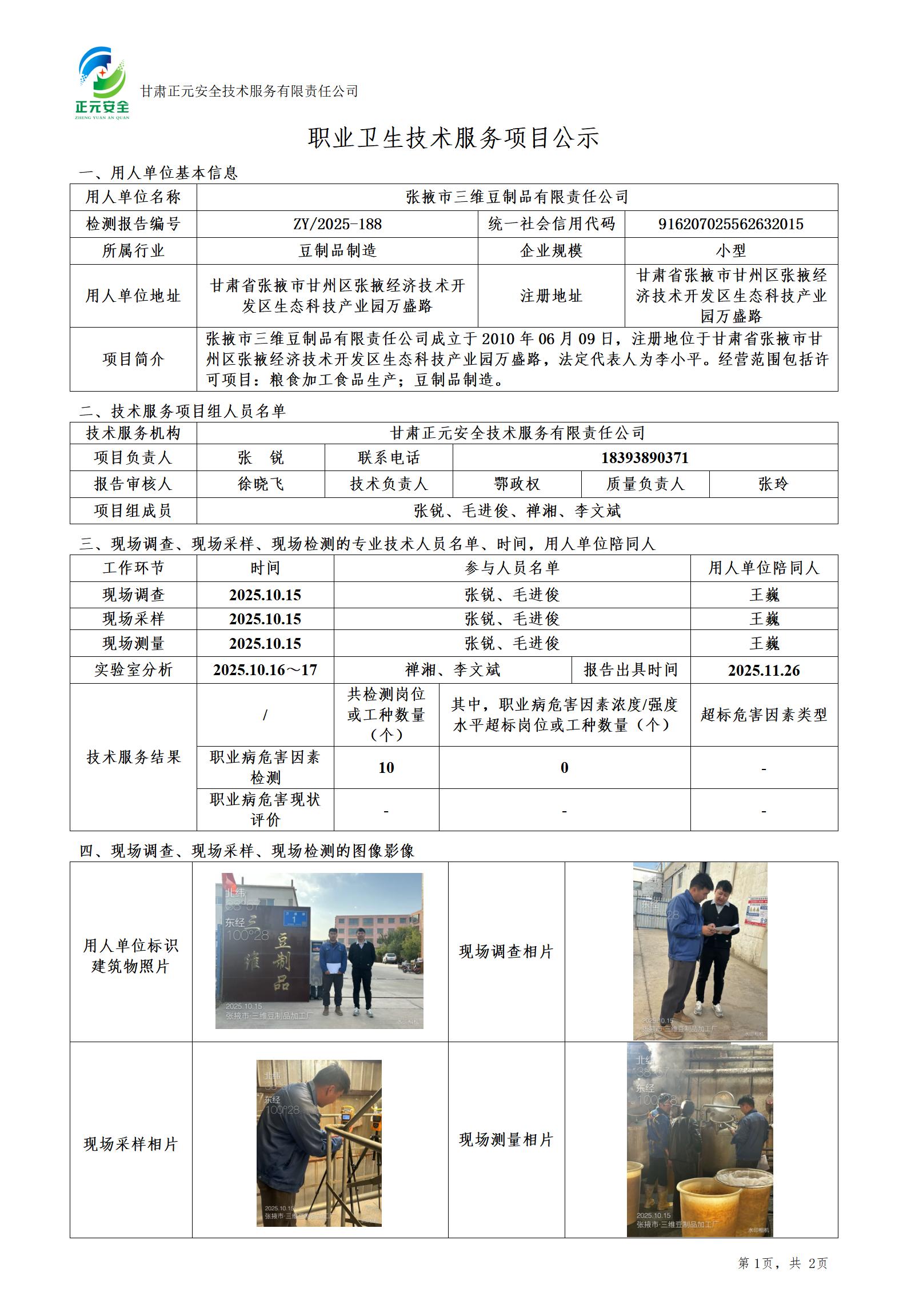 张掖市三维豆制品有限责任公司职业病危害因素定期检测