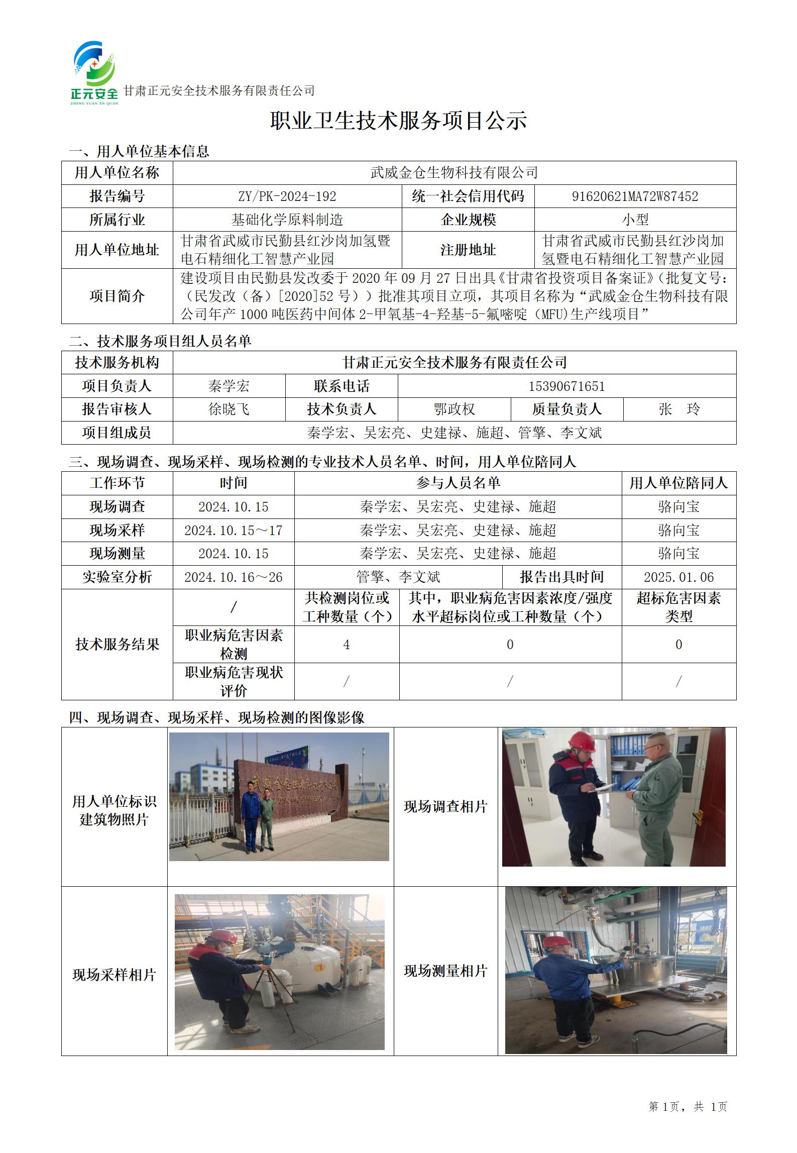武威金仓生物科技有限公司年产1000吨医药中间体MFU项目职业病危害控制效果评价