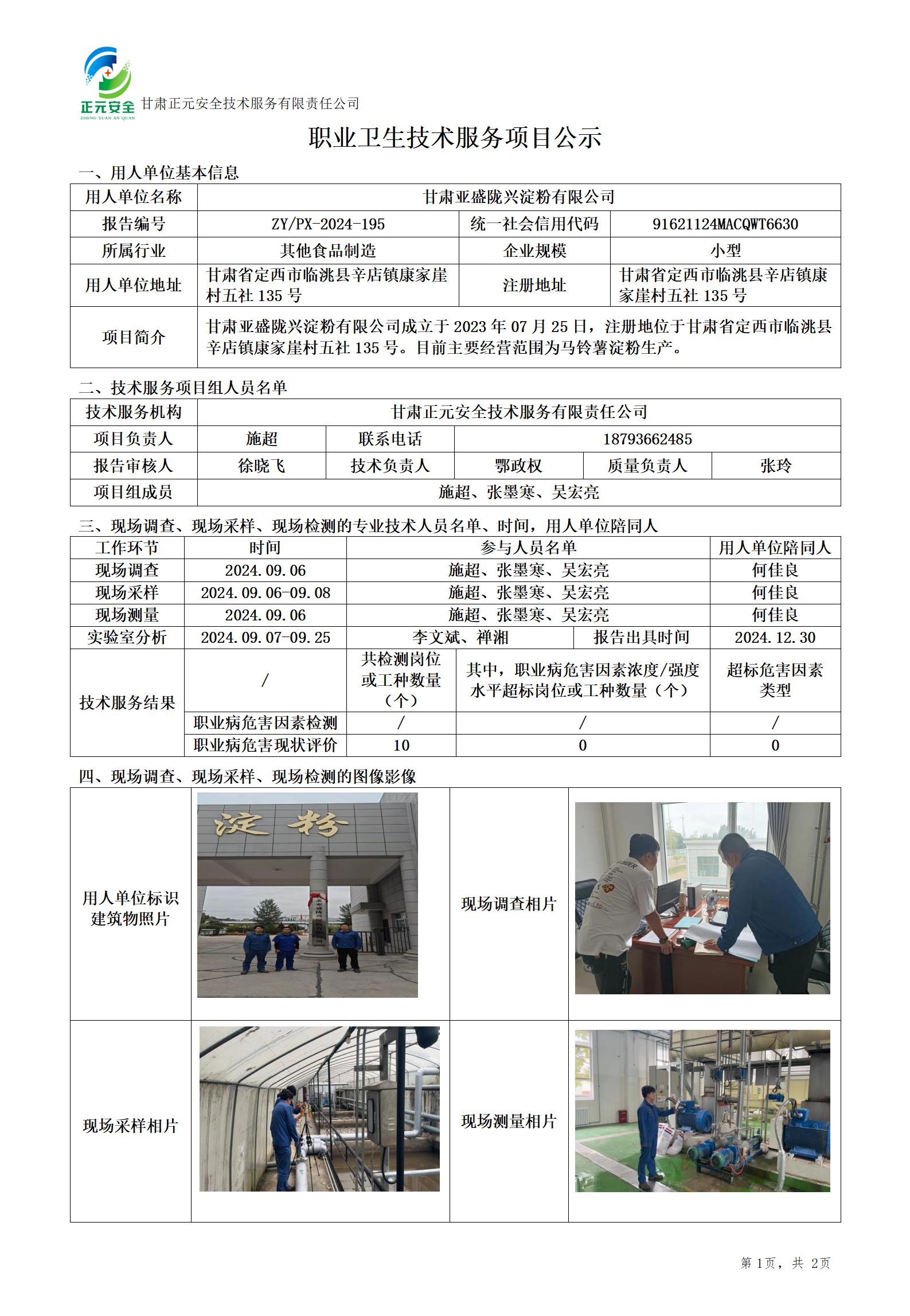 甘肃亚盛陇兴淀粉有限公司职业病危害现状评价