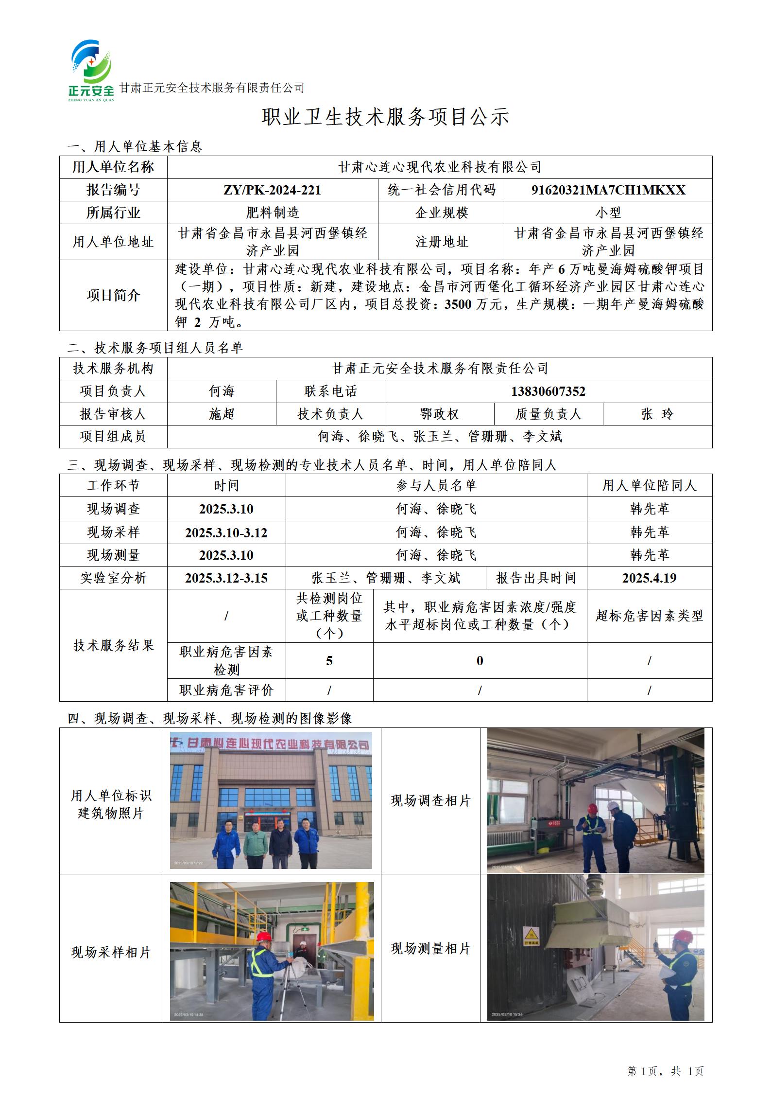 甘肃心连心现代农业科技有限公司年产6万吨曼海姆硫酸钾项目职业病危害控制效果评价