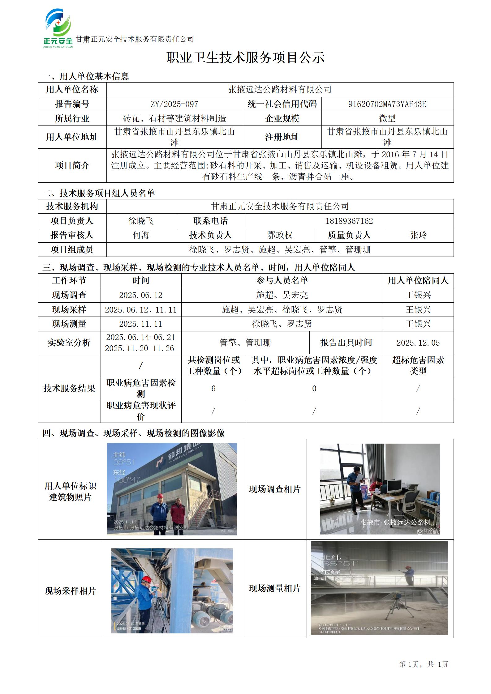 张掖远达公路材料有限公司职业病危害因素检测