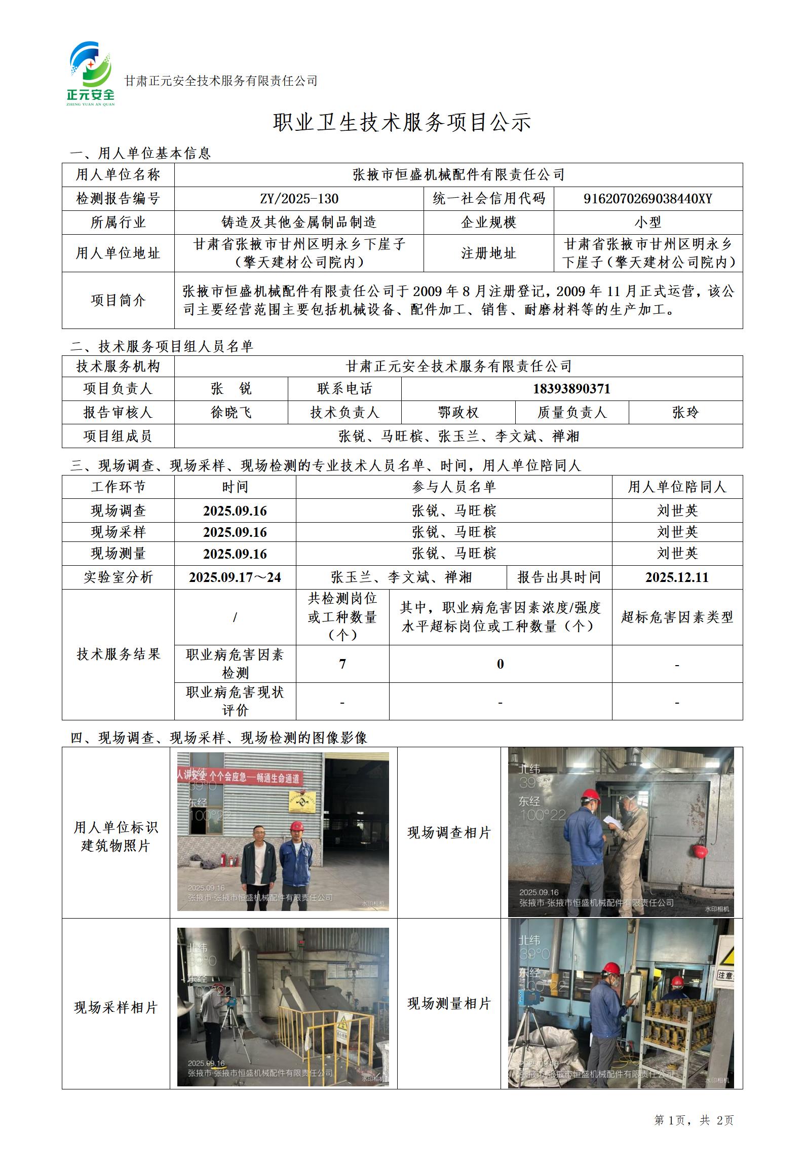 张掖市恒盛机械配件有限责任公司职业病危害因素检测