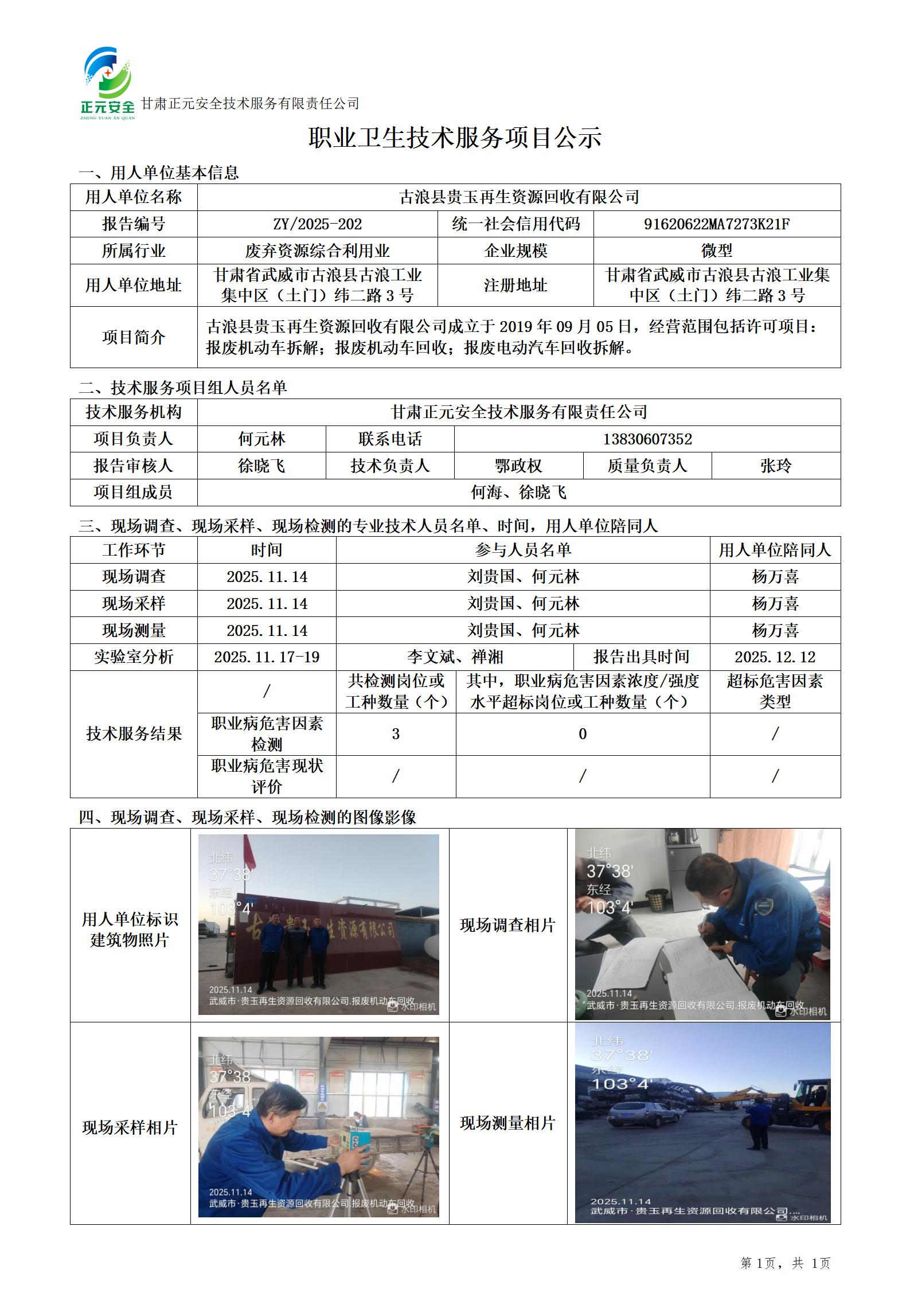 古浪县贵玉再生资源回收有限公司职业病危害因素定期检测