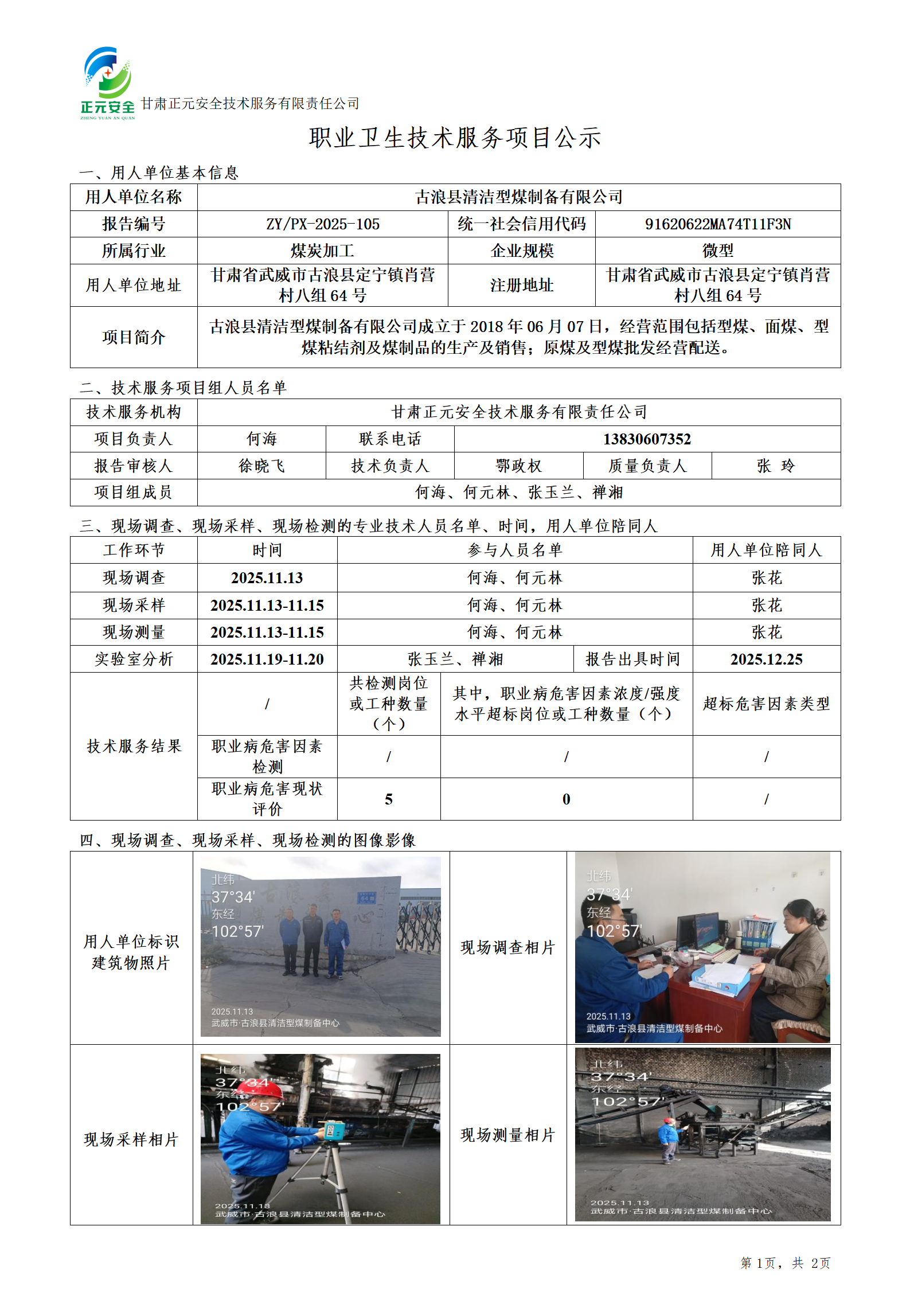 古浪县清洁型煤制备有限公司年产10万吨洁净型煤项目职业病危害现状评价