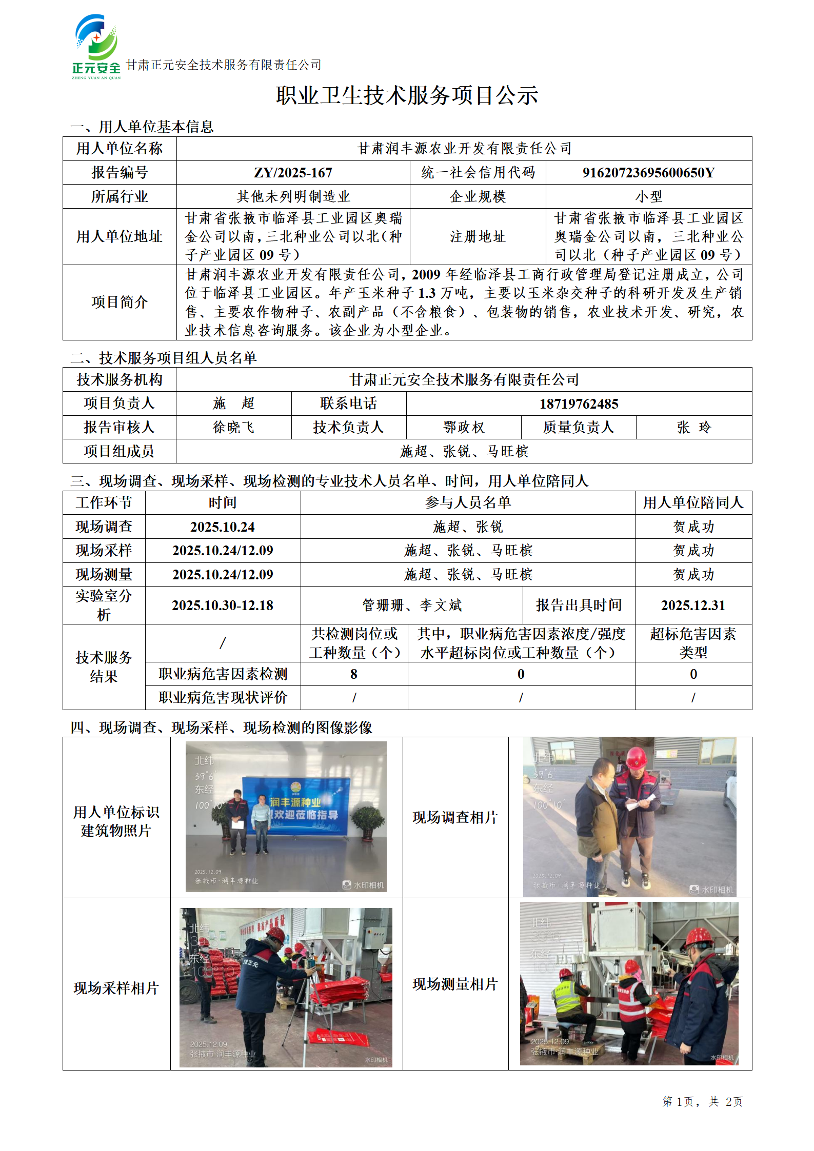 甘肃润丰源农业开发有限责任公司职业病危害因素检测