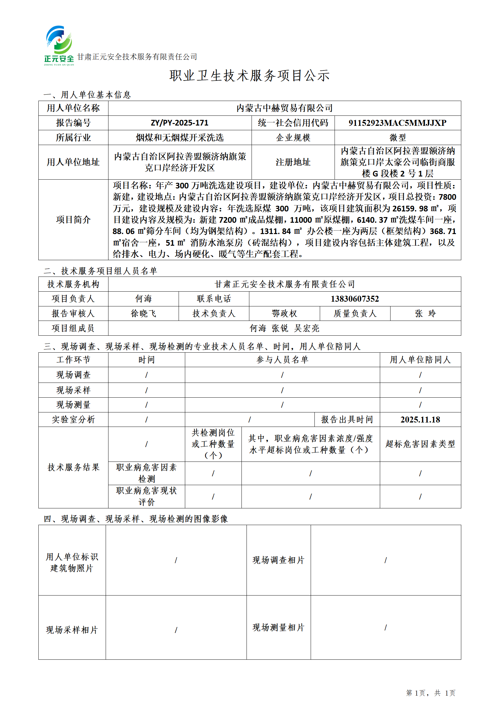 内蒙古中赫贸易有限公司年产300万吨洗选建设项目职业病危害预评价